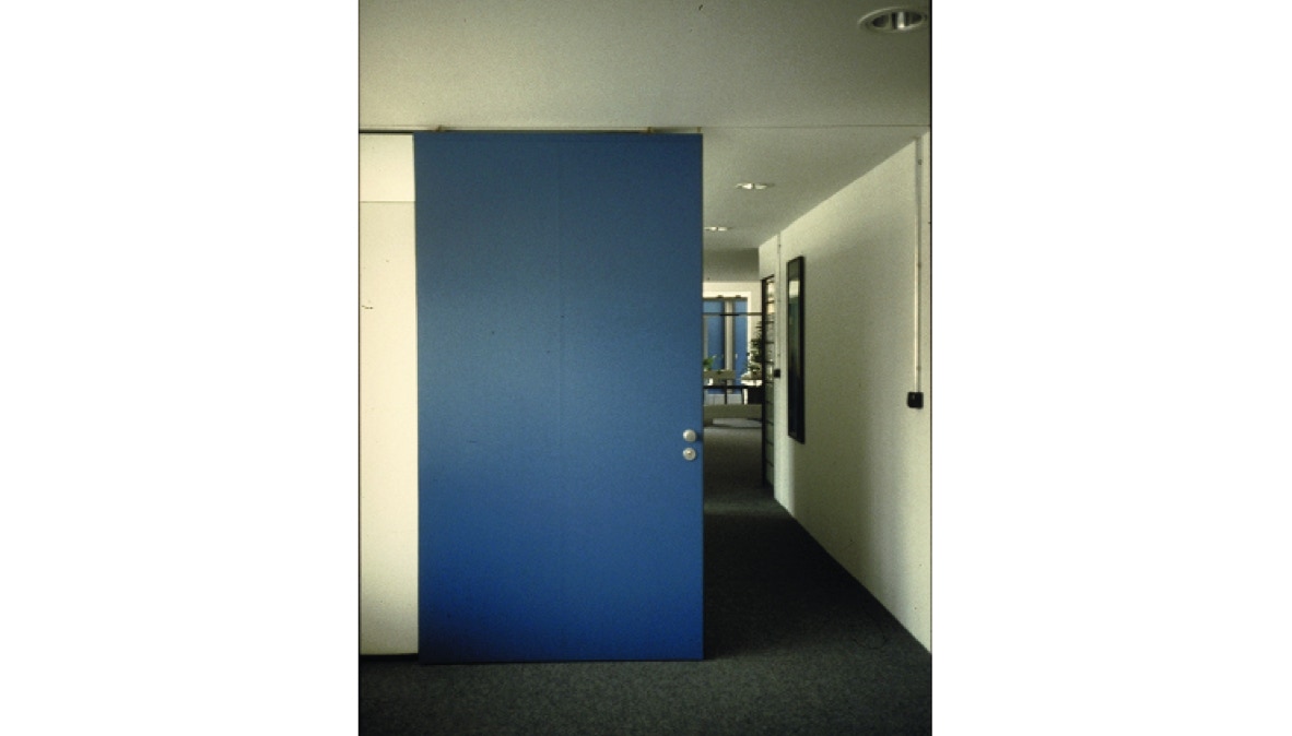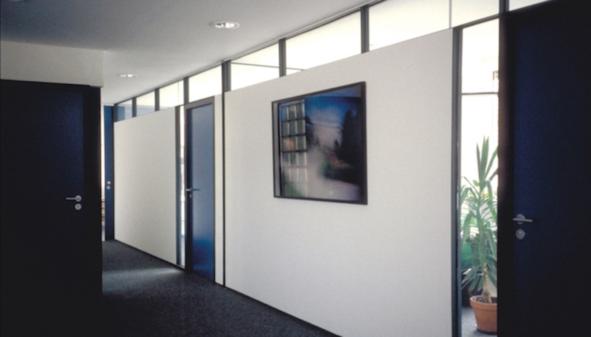 In den Großraum wurde ein Block aus einer mit Gipsdielen und Glasflächen ausgefachten Stahlkonstruktion aufgestellt, der den Raum strukturiert: seitlich die Erschliessung, am Kopfende Schulungsräume und am Flurende das Zimmer für die Referenten. In dem Block selbst befinden sich die Büroräume der Vorstandsmitglieder.