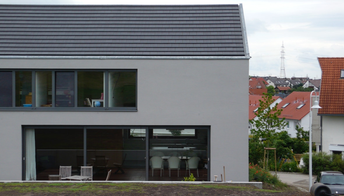 Das Haus ist in zwei Bereiche unterschiedlicher Qualität unterteilt. Ein großer Wohnraum mit Küche und Arbeitsplatz, der sich zum Garten hin öffnet sowie Einzelzimmer für Kinder und Eltern im Obergeschoss. Beide Lebensbereiche sind durch einen Luftraum, der ungewohnte Sichtverbindungen zulässt, verknüpft.