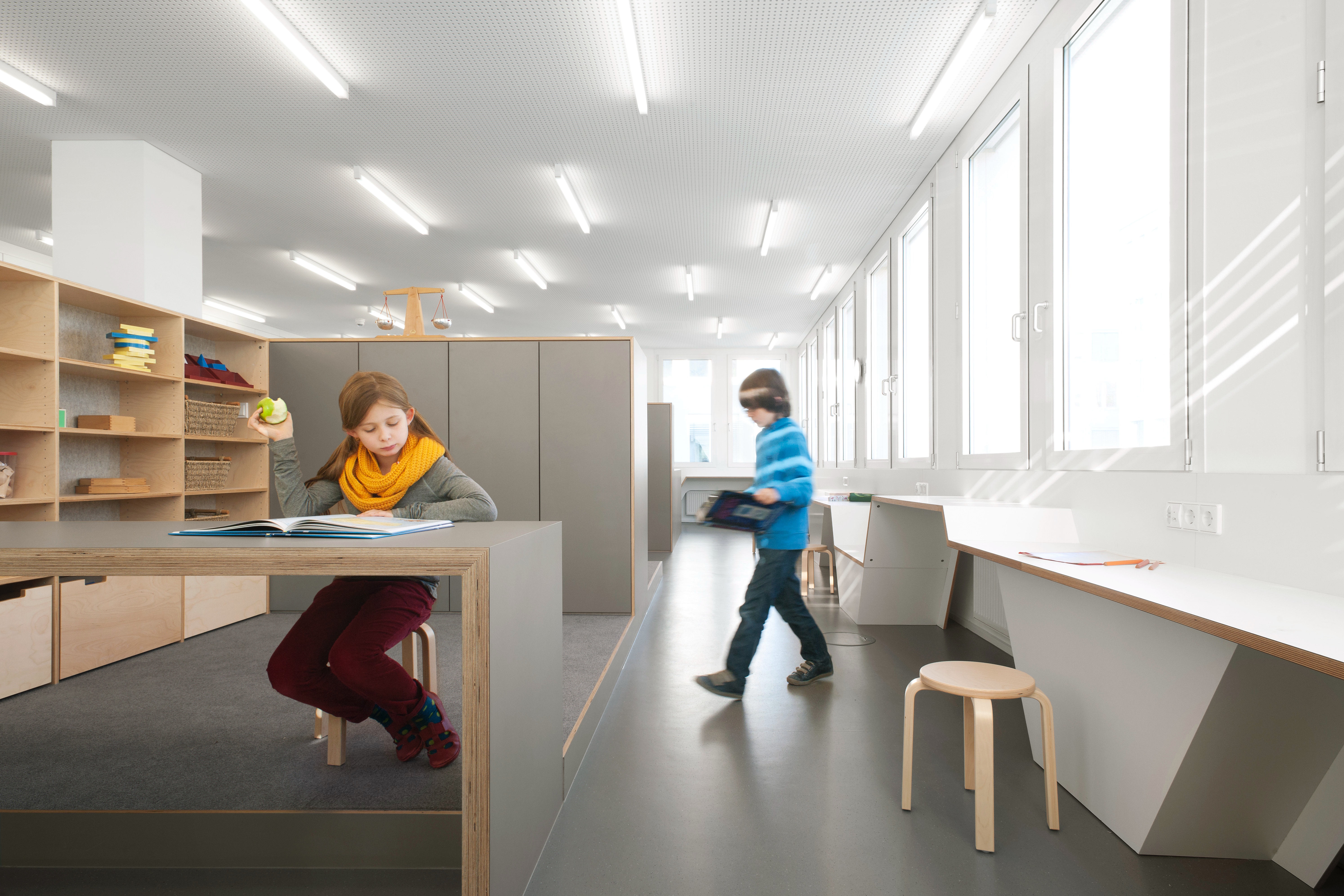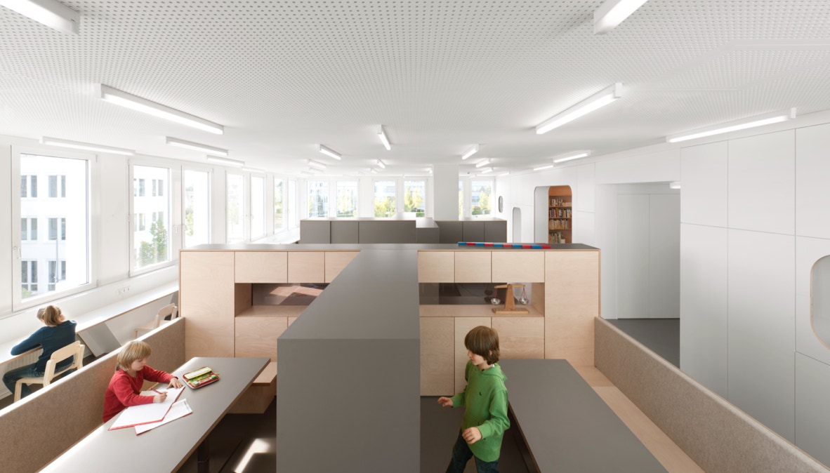 Die zur Verfügung stehende Bürofläche wurde bis auf die Technikkerne komplett entkernt. Es entstanden zwei große Räume, in denen freistehende Einbauten, entsprechend dem pädagogischen Konzept der Schule, unterschiedliche Tätigkeiten unterstützen. Der Aktionsbereich, mit Garderobe, Labor, Atelier und Bewegungsraum sowie der Arbeitsbereich mit zwei differenziert ausgestatteten Lerninseln. Eine raumhohe Schrankwand bietet mit eingebauten Raumnischen (Lesehöhle, Zirbelstube) Rückzugs- und Ruheräume an. Entlang der Fassade befinden sich umlaufend die Einzelarbeitsplätze in unterschiedlicher Höhe, so dass sitzend oder stehend auch individuell gearbeitet werden kann.