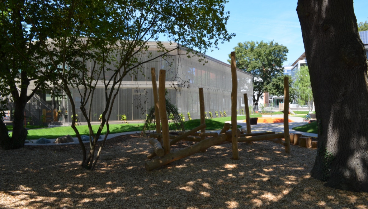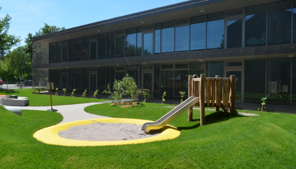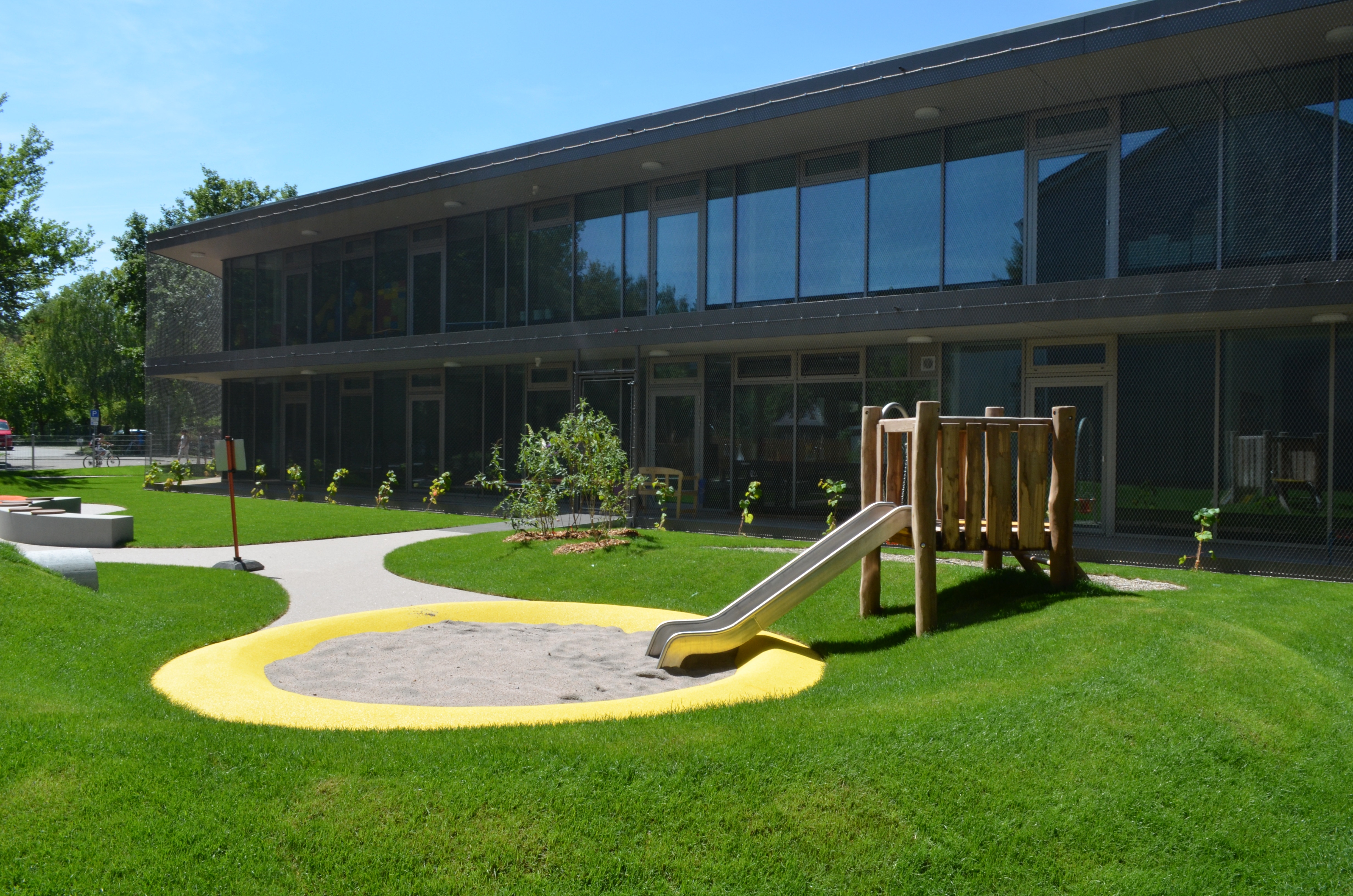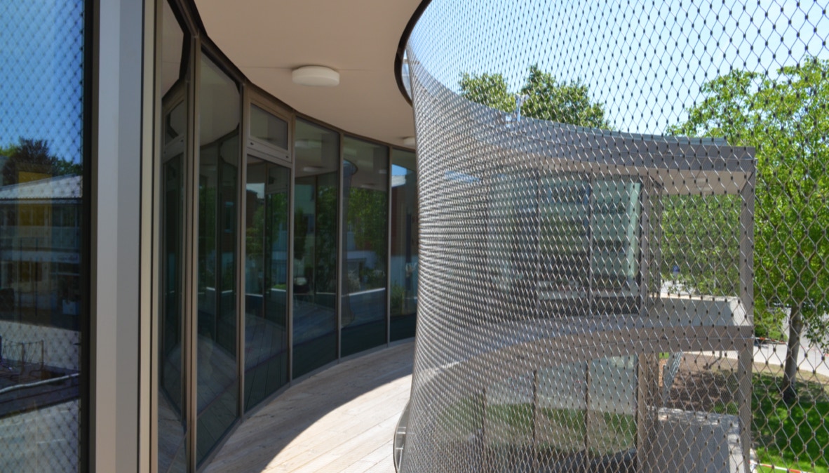 Aus dem so entwickelten klaren, scharfkantigen Baukörper mit einer dominanten Schichtung der Geschosse, wurden Kreissegmente herausgeschnitten, um den alten Baumbestand zu berücksichtigen und in das Gebäude zu integrieren. Um das gesamte Gebäude ist ein Netz aus Edelstahl geschlungen. Dies dient bei freiem Ausblick (auch für Kinder) der Absturzsicherung. Das Netz wurde begrünt und schützt so den Innenraum zusätzlich vor Sonneneinstrahlung.