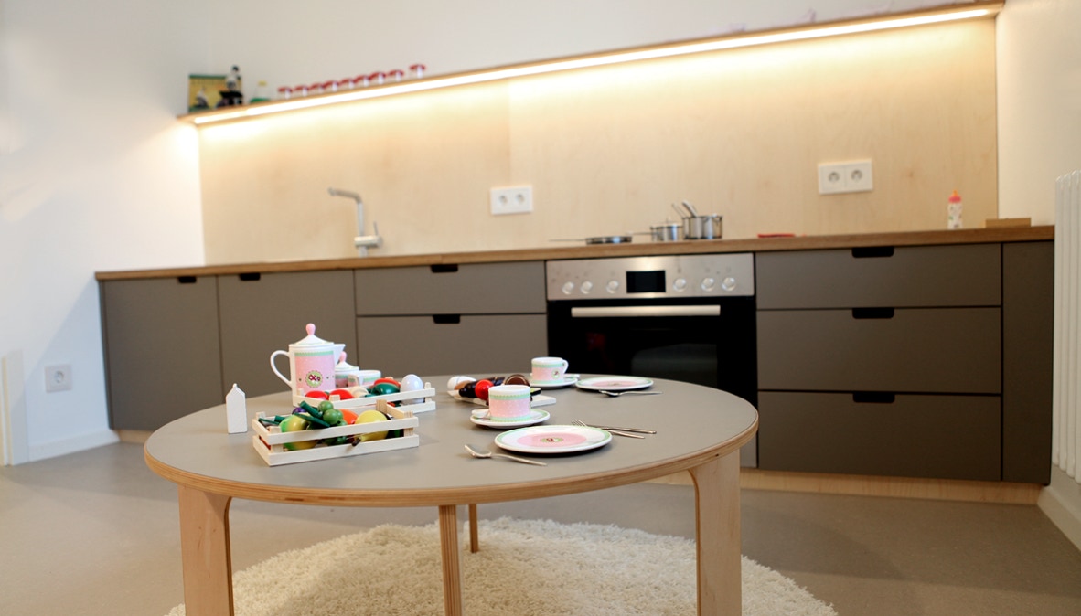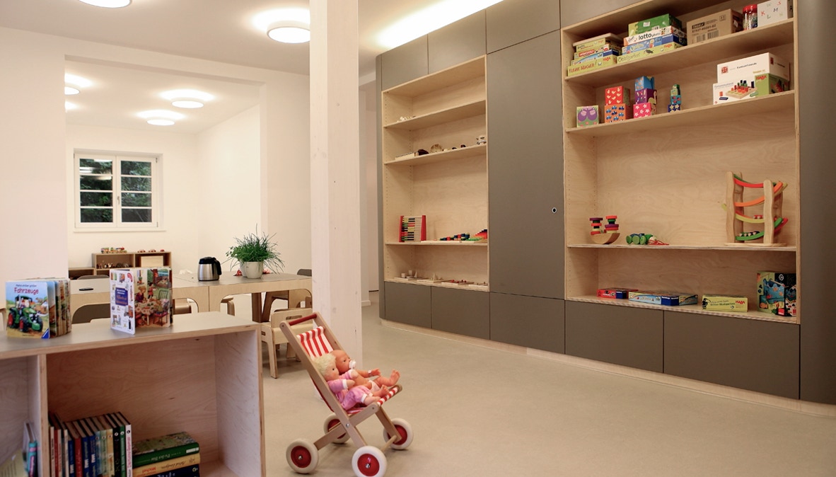 Das Haus aus den 30er Jahren wurde entkernt, energetisch saniert und für die neue Nutzung als Kindertagesstätte für 50 Kinder umgebaut.