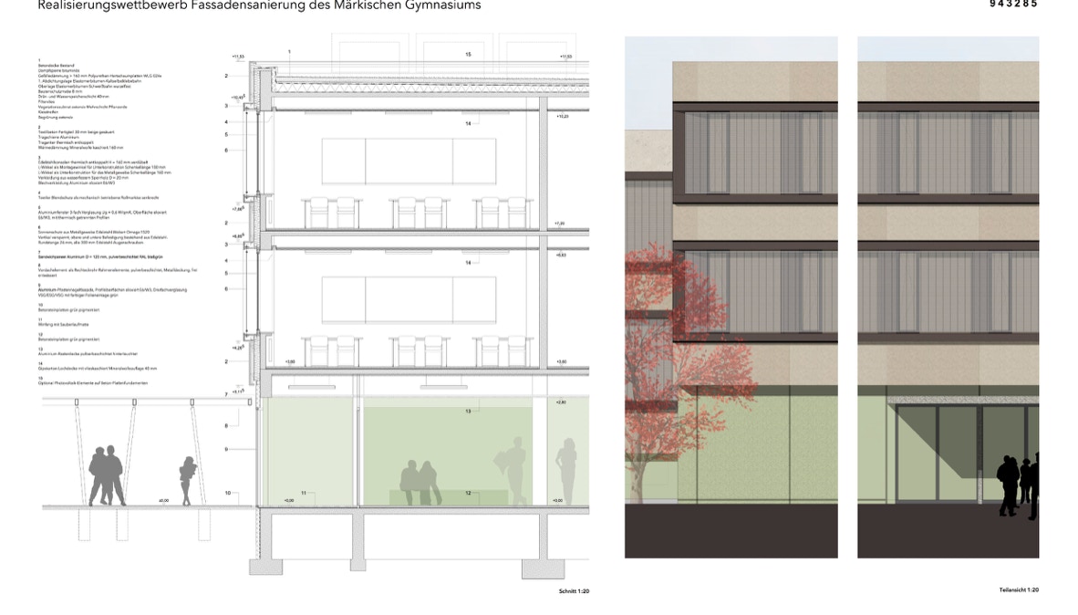 Die Waschbetonfassade des Märkischen Gymnasiums in Hamm ist sanierungsbedürftig. Die fortschreitende Korrosion der Armierung führt zu Abplatzungen, Teile der Fassade mussten bereits abge-nommen und durch Provisorien ersetzt werden.