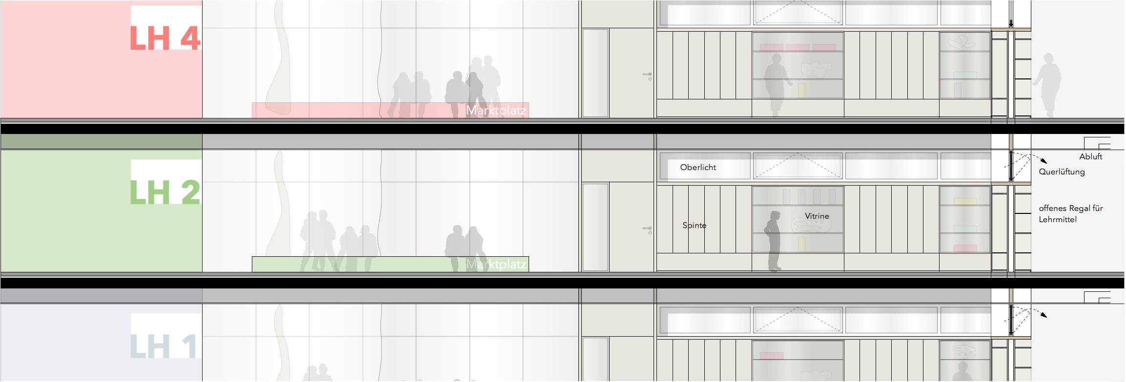 Die klare räumliche Zuordnung der Lernhäuser pro Geschoss und Gebäudeflügel erlauben eine gute Orientierung im Gebäude. Ein großzügiger Flur erschließt das Raumangebot und bietet Platz für das Ankommen (Garderobe/Spinte) sowie für Austausch und Interaktion zwischen den Schülern. Er ist Teil des Lernumfeldes und weit mehr als nur Erschließung. Eine Bank entlang des Fensterbandes lädt zum Verweilen ein, Seitenlichter erlauben den Ein- und Ausblick in die Lernräume, in die Zwischenwand integrierte Vitrinen bieten Platz für Ausstellungen.