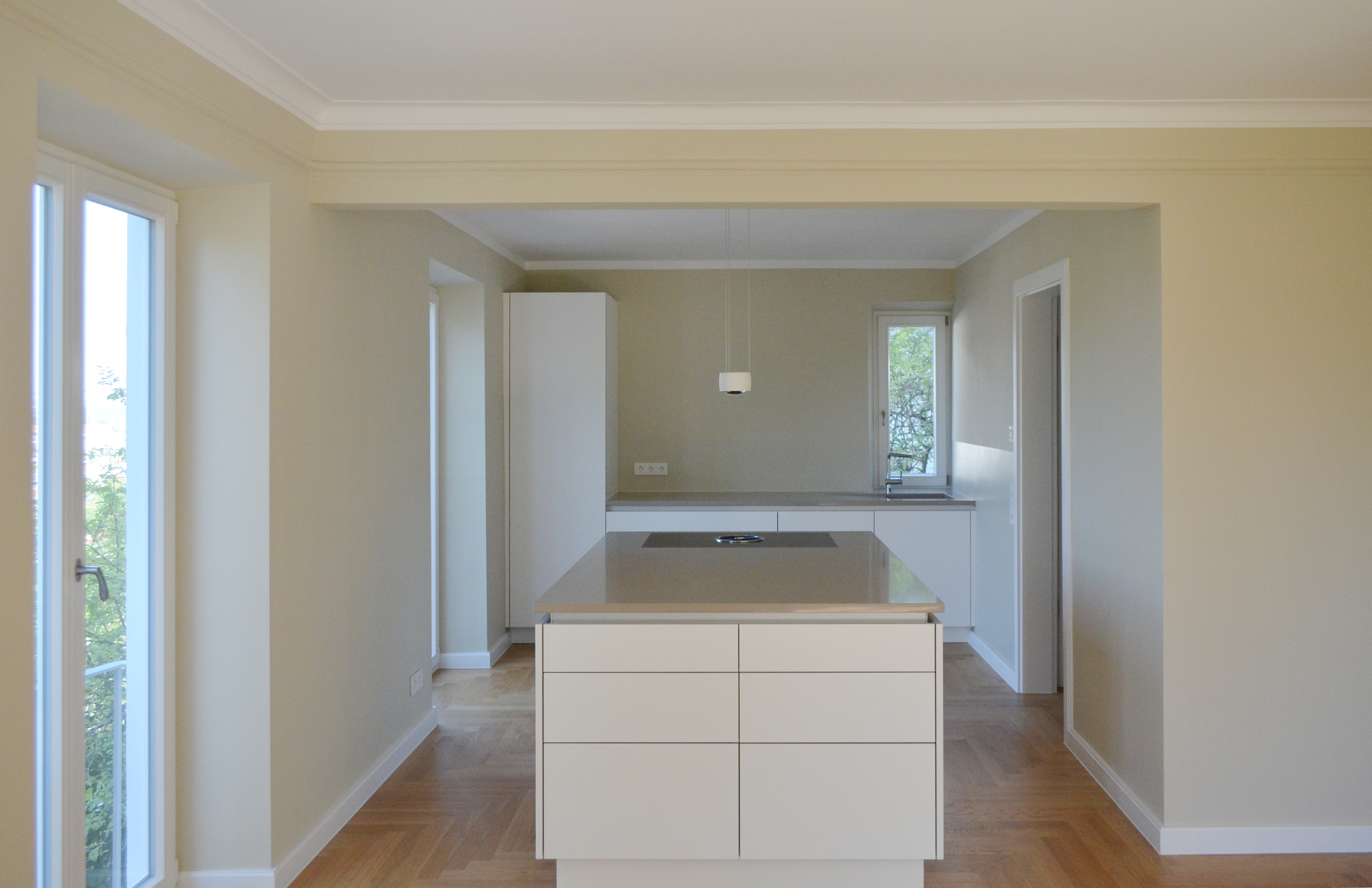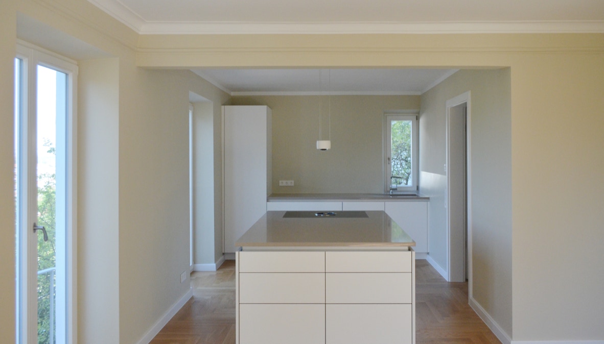 In diesem Mehrfamilienhaus aus den 30 Jahren wurde die Wohnung im Gartengeschoss kernsaniert. Die Raumzuschnitte wurden hierbei kaum verändert, lediglich die Küche mit dem Wohnraum verbunden. Eine zusätzliche Fensteröffnung auf der Strassenseite öffnet den Blick über die Stadt. Eingriffe aus den 60er Jahren konnten rückgebaut und die ursprüngliche Fassadengliederung wiederhergestellt werden.