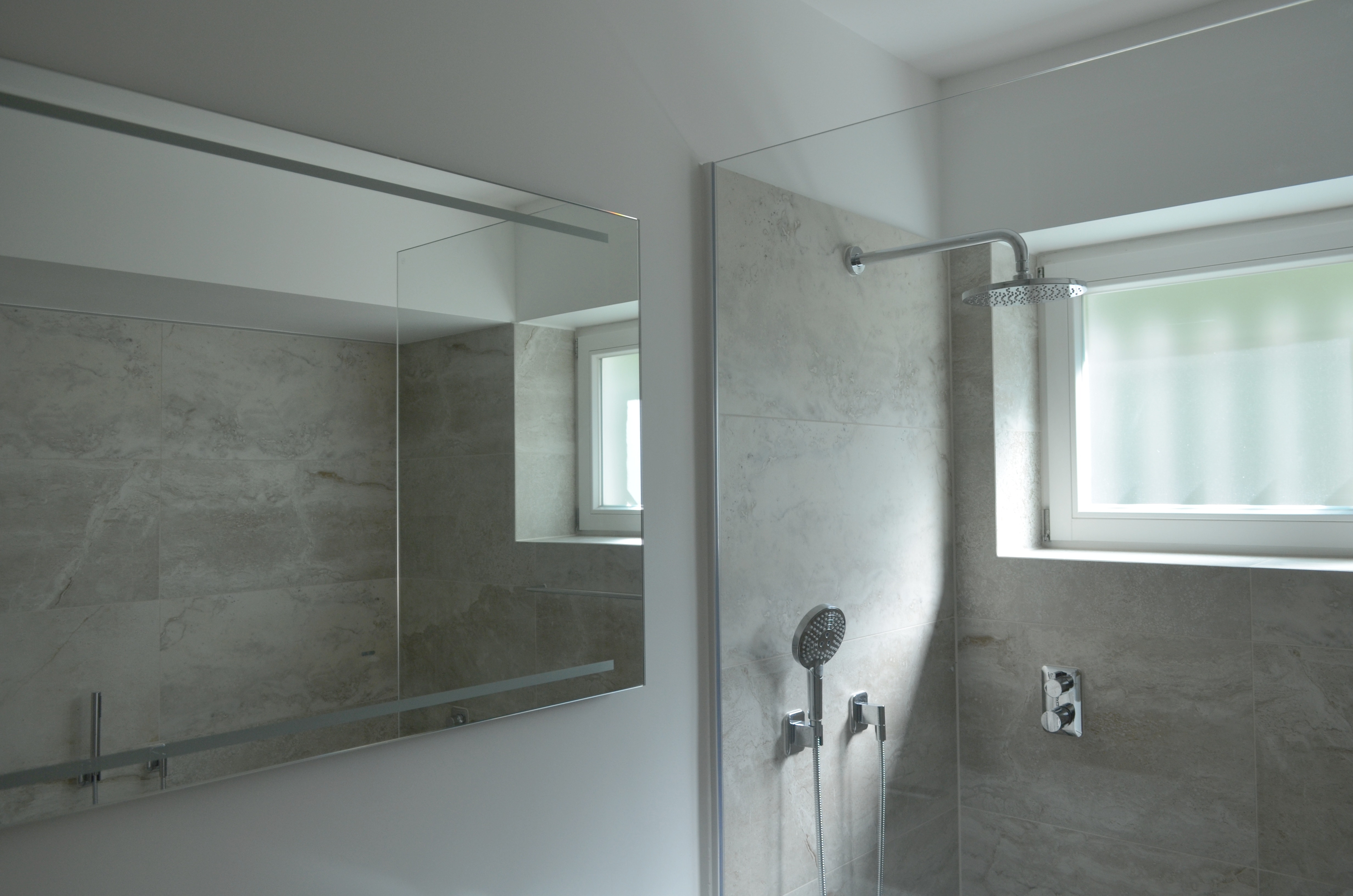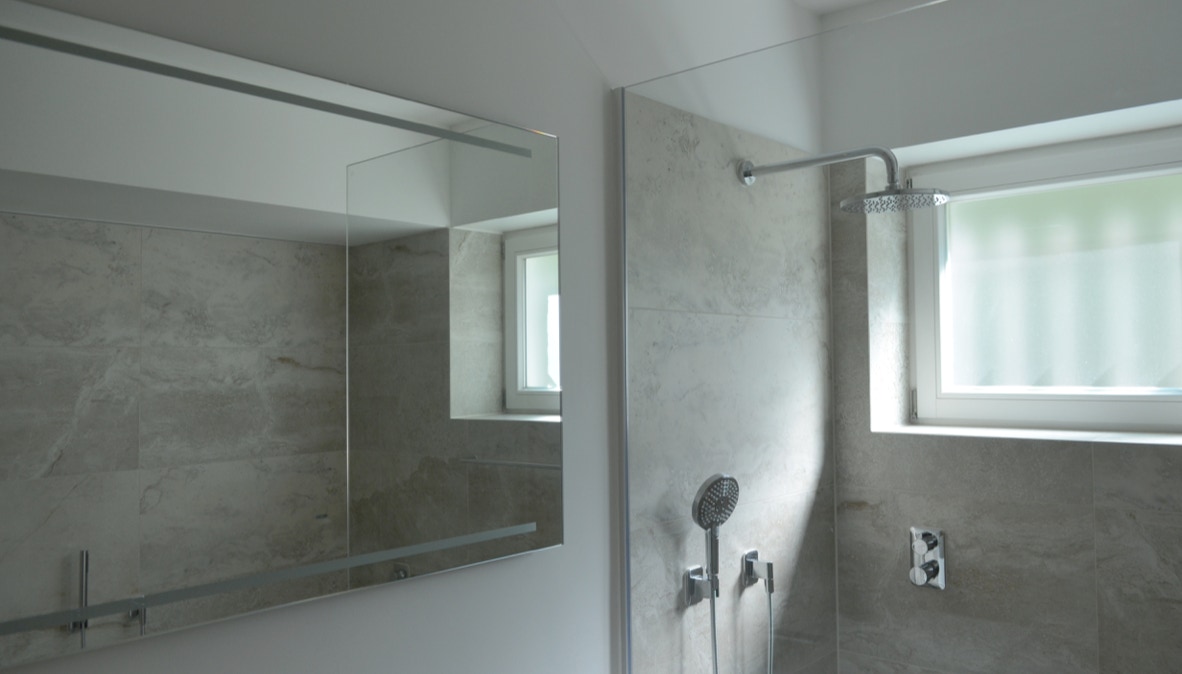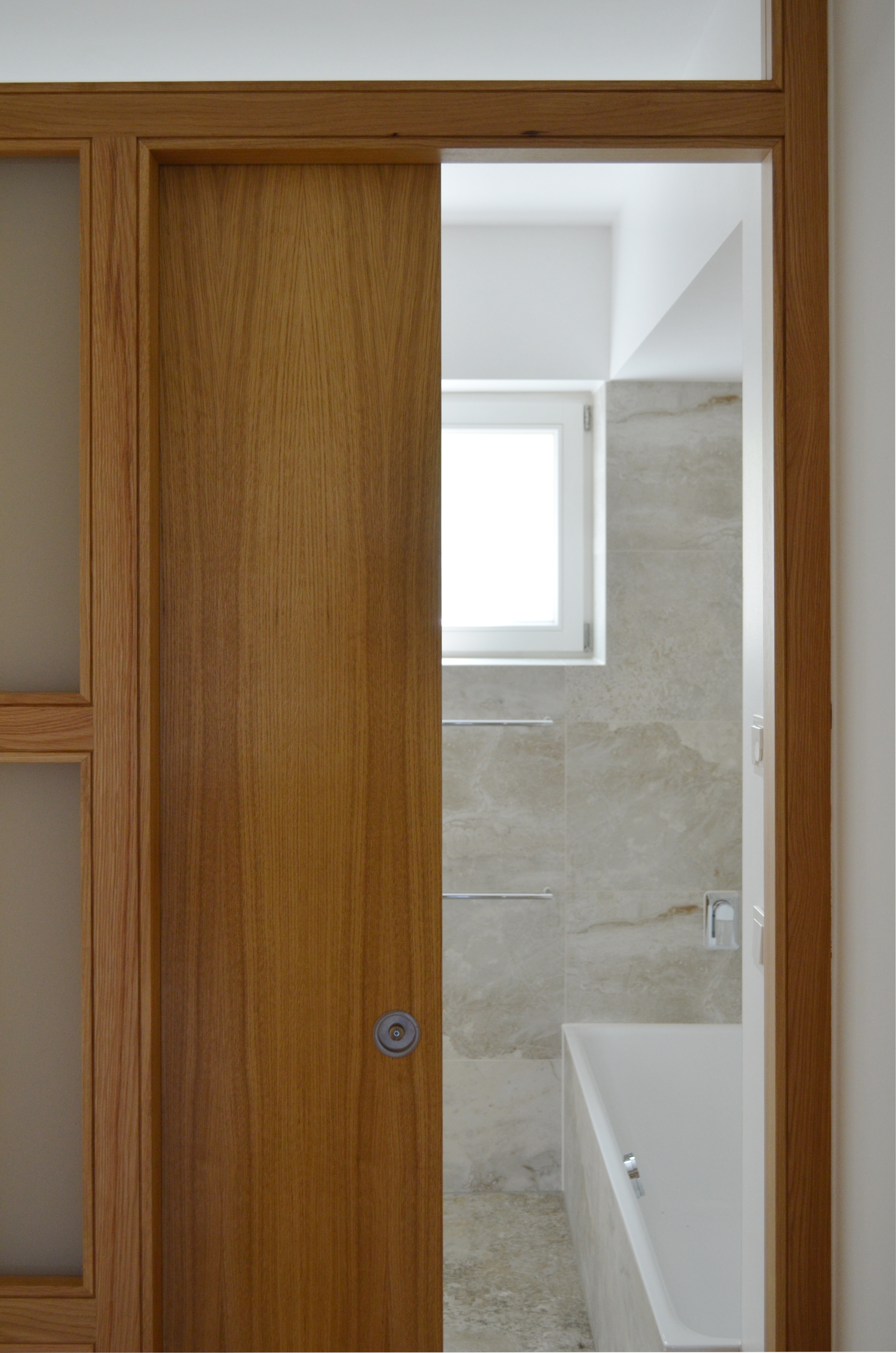 Ein kleines Bad, das bisher als Durchgangsraum zu den Schlafräumen diente, wurde separat erschlossen und mit einer Schiebewand aus Eichenholz und Glaselementen vom Flurbereich getrennt. Glasflächen, Muschelkalk und Eichenholz bestimmen den Raum.